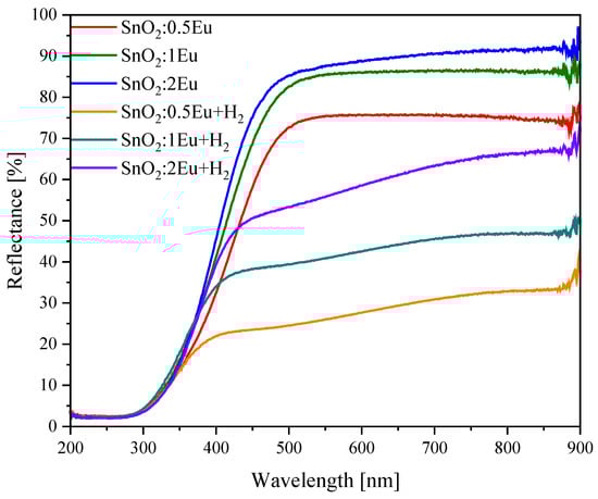 Diffuse reflectance spectra of the SnO2:xEu and SnO2:xEu + H2 samples.