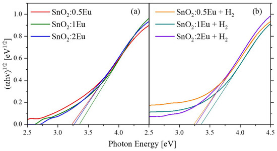 Optical absorption edge in Tauc plot of SnO2:xEu (a) and SnO2:xEu + H2 (b) samples.