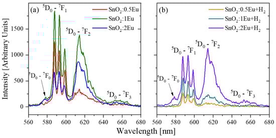 To further study the Eu local environment, the pulse cathodoluminescence (PCL) was measured (Figure 10). Luminescence spectra of Eu3+ centers in crystalline SnO2 matrices may provide important information about its substitutional position with different crystalline fields in the host [17,40]. The 5D0→7F1 are magnetic dipole allowed transitions and therefore are not affected by nearby structural changes. However, the 5D0→7F2 is electric dipole-ruled and hypersensitive to the local crystalline field [40]. The ratio between these two transitions (5D0→7F2/5D0→7F1) is called the asymmetric ratio (R21, Table 4) and can be used for conclusions about the location distribution of the Eu3+ in the SnO2 matrix [41]. The lower value of R21 shows that the Eu3+ may be located at no distorted site substitute for Sn4+ with oxygen vacancy formation to guarantee the charge neutrality of the solid. It is a case of SnO2:0.5Eu samples where the number of dopant atoms is relatively low and lattices are not disordered. Differently, the increase in the asymmetric ratio (SnO2:2Eu samples, Table 4) indicates that more Eu3+ species are located mainly at distorted sites at the SnO2 matrix. This conclusion is also supported by the distortion of the unit cell, which is indicated by the changing of lattice parameters (see Table 1). On the other hand, the PCL of SnO2:2Eu is quenched due to the higher dopant concentration. It should be noted that annealing tends to quench luminescence, which could be caused by non-radiative relaxation through a higher number of oxygen vacancies. Moreover, the annealing in hydrogen reduces the asymmetric ratio R21 (Table 4) that is also confirmed by the Eu3+ local environment changes by the oxygen vacancy creation. In addition, the study of PCL spectra confirms the possibility of the formation of highly non-stoichiometric regions, which can cause an increase in intensity at the edge of the valence band (Figure 7), which explains the incomplete disappearance of this feature after annealing.