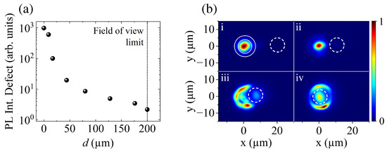 (a) PL intensity of the defect measured at different distances (d) from the polariton condensate. (b) Polariton condensate PL at different distances: (i) 20 µm, (ii) 10 µm, (iii) 7 µm, and (iv) 0 µm. The solid lines in panel (i) depict the ring-shaped excitation profile with a diameter of 10 µm. The dashed lines indicate the location of the defect. All measurements were performed at P = 1.4.