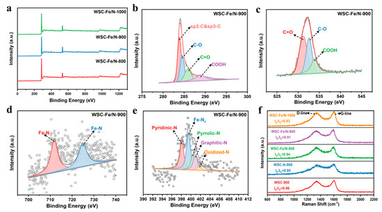 XPS spectra of (a) WSC-Fe/N-800, WSC-Fe/N-900, and WSC-Fe/N-1000; (b) C 1s, (c) O 1s, (d) N 1s, and (e) Fe 2p for WSC-Fe/N-900. (f) Raman spectra of different samples.
