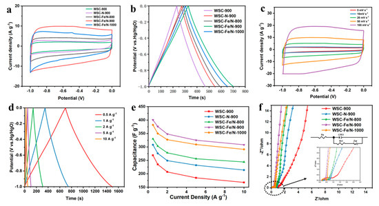 The electrochemical effectiveness of all specimens was assessed using a three-electrode system with a 6 M KOH electrolyte solution. The CV curves of the samples (Figure 5a) display an approximately rectangular shape, indicative of typical electric double-layer capacitance (EDLC). The greatest area was displayed by WSC-Fe/N-900, indicating greater charge storage capacity. The CV curves of the WSC-Fe/N-T series also showed a faint broad peak, suggesting the presence of extra pseudocapacitance from redox processes involving nitrogen and oxygen heteroatoms as well as pseudocapacitance linked to Fe-Nx structures [33]. At scan rates as high as 100 mV s−1, the CV trends of WSC-Fe/N-900 (Figure 5c) remained largely undistorted and stable across the range of 5 to 100 mV s−1, demonstrating excellent rate performance and steadiness.