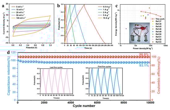 The electrochemical performance of the symmetric supercapacitor, denoted as WSC-Fe/N-900-SC, was evaluated using WSC-Fe/N-900 for both the anode and cathode and a 6 M KOH mixture as the conductors. Figure 7a presents the CV curves of WSC-Fe/N-900-SC at sweep speed ranging from 5 to 100 mV s−1. Excellent EDLC features were demonstrated as the quasi-rectangular form was maintained with increasing scan rate, even up to 100 mV s−1. Figure 7b shows the GCD curves of WSC-Fe/N-900-SC at different current densities. Each curve exhibited a triangular shape, with a specific capacitance of 66.2 F g−1 (derived from Equation (S5)) at a current density of 0.5 A g−1. Even at a superior current density of 10 A g−1, the specific capacitance remained at 50.3 F g−1, corresponding to a capacitance retention of 76%. To assess the practical effectiveness of the supercapacitor, the energy and power densities of WSC-Fe/N-900-SC were calculated using Equations (S6) and (S7). WSC-Fe/N-900-SC achieved a superior energy density of 9.2 Wh kg−1 at a power density of 250 W kg−1 and a superior power density of 6.5 kW kg−1 at 5000 W kg−1 (Figure 7c). These results indicate a significant advantage over other biomass-derived supercapacitors [37,38,45,46,49,50,51,52,53]. Figure 7d illustrates the cycle stability of the WSC-Fe/N-900-SC supercapacitor tested at a current density of 10 A g−1. The supercapacitor exhibited remarkable electrochemical stability and significant recoverability, attaining a capacitance retention of 93% and a Coulombic efficiency of 98.9% after 10,000 cycles.