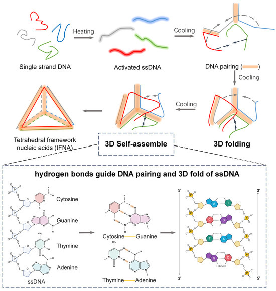 Schematic illustration showing the three-dimensional folding and self-assembly of specific DNA single strands to form tetrahedral-framework nucleic acids (tFNAs). DNA single-strands, which are stretched by heat, form complementary pairing with each other based on specific sequences during the cooling process, and the pairing with multiple single strands guides the single strands in three-dimensional folding and finally forms a simple and stable tetrahedral-framework nucleic acid structure.