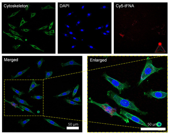 L929 cells were starved of 0% medium for 24 h before being cultured in medium containing 250 nM Cy5-modified tFNA for 48 h. Afterwards, they were washed and fixed with 4% paraformaldehyde, their cytoskeleton was stained with FITC phalloidin, the nuclei were stained with DAPI, and the cells were visualized by laser confocal microscopy.