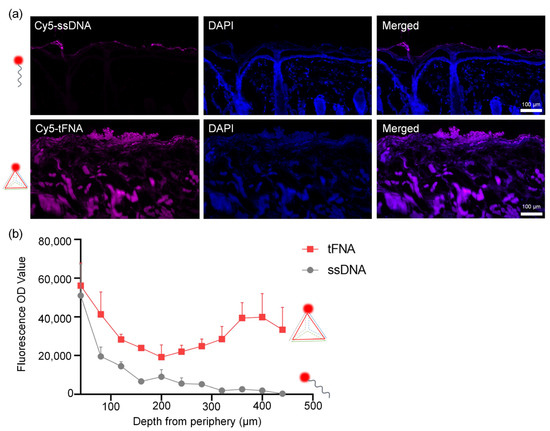 High penetration ability of tFNAs. (a) Depth of penetration of Cy5-ssDNA and Cy5-tFNAs into the mucosa. (b) Corresponding fluorescence semiquantitative measurement. Cy5-tFNAs could penetrate the skin as deep as 450 μm from the periphery within 24 h.