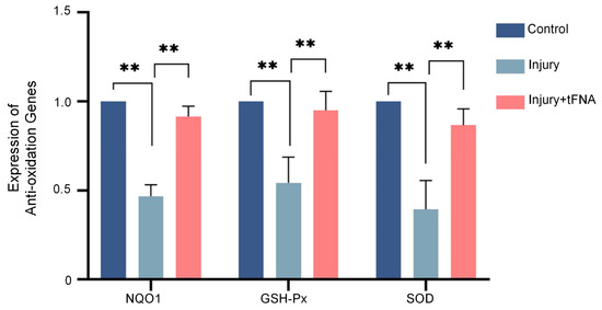 tFNA increased expression of anti-oxidation-related genes. Expression of NQO1, GSH-Px, and SOD genes significantly decreased after injury, and tFNA treatment reversed the trend. (** p < 0.01).
