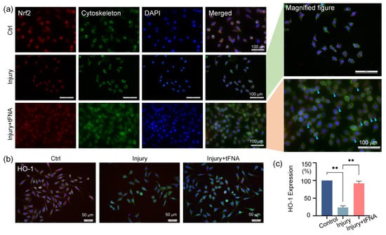 As for Nrf2, the tFNA induced more Nrf2 for nuclear translocation (Figure 8a). Figure 8b,c revealed that HO1 expression was attenuated to 0.23-fold of that in the control group after burn injury and up-regulated to 0.92-fold by tFNA.
