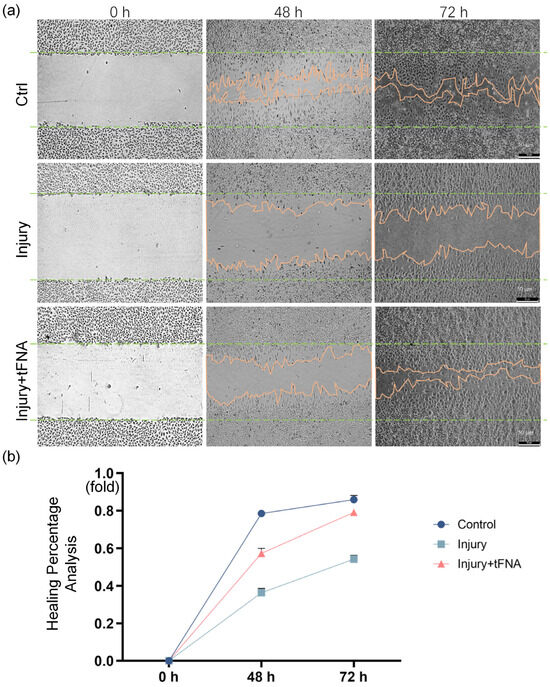 After confirmation of cell proliferation, we evaluated their migratory ability using a scratch assay (Figure 11a,b). Within 72 h after scratch modeling, the undamaged cells in the control group migrated normally and gradually to fill the scratch defects, and the healing ratio reached 78.50% and 85.89% at 48 and 72 h, respectively, whereas the cells in the injury group had a reduced migratory ability, and the healing ratio reached only 36.34% and 54.27% at 48 and 72 h, respectively. The migration ability of the damaged cells under tFNA treatment reached 1.57 times (57.37% healing percentage) that of the injury group at 48 h and 1.45 times (79% healing percentage) that of the injury group at 72 h.