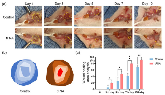 In vivo pro-healing effect of tFNA on oral mucosal burn wounds. (a) Photographs of full-thickness burn wounds treated with PBS and tFNA on the 1st, 5th, 7th, and 10th days after treatment. Yellow dashed circles points to the wound contour. (b,c) Calculation and comparison of ulcer-healing area of blank and tFNA groups. tFNA effectively promoted wound closure throughout the full cycle of post-injury healing. Data are presented as mean ± SD (n = 4). Statistical analysis: * p < 0.05; ** p < 0.01.