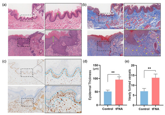 Subsequent HE and Masson staining (Figure 13a,b,d,e) further analyzed the healed structures. The tFNA group healed with thicker epidermal regeneration (95.69 μm in the tFNA group and 51.11 μm in the injury group) and more blood vessels than the injury group (17.75 in the tFNA group and 7 in the injury group). Additionally, the amount of orderly and arranged collagen fibers resulted in higher-quality healing.