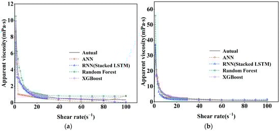 The same four models, without changing the input parameters, adjusted the output parameters to predict and evaluate the shear rate and apparent viscosity curves of the new version of the cement paste, according to the predictive statistical parameters in Table 3, it can be seen that the RNN (Stacked LSTM) model has the highest accuracy in predicting the apparent viscosity of the freshly mixed cement paste, and the coefficient of determination, R2, reaches 92%, which is mainly due to the fact that the LSTM model is more capable of memorizing the time-ordered data; at the same time, all of the overall performances of the deep learning neural network model are better than that of the integrated learning method of machine learning, and the visualization is shown in Figure 11.