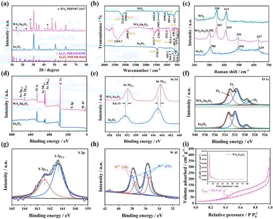 (a) XRD patterns of In2O3 and WS2/In2O3 NFs. (b) FT-IR spectra and (c) Raman spectra of pristine In2O3, WS2, and WS2/In2O3 NFs. XPS spectra of (d) survey, (e) In 3d, and (f) O 1s of In2O3 and WS2/In2O3 NFs; (g) S 2p, and (h) W 4f of WS2/In2O3 NFs. (i) N2 adsorption–desorption isotherms and pore-size distributions of WS2/In2O3 NFs.