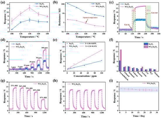 Sensing properties measurements for pristine In2O3 and WS2/In2O3 sensors at 140 °C. (a) Responses toward HCHO (100 ppm) under operating temperatures from 100 to 180 °C; (b) base resistance in air of the two sensors at varied operating temperatures; (c) the dynamic sensing transients to 100 ppm HCHO; (d) the dynamic response and recovery curves of sensors to different concentrations of HCHO; (e) fitting linearity curves of the concentration of sensors vs. the response value; (f) cross-responses of two sensors for detecting 100 ppm of various gases; (g) dynamic response curves of the WS2/In2O3 sensor to 100 ppm HCHO in different humid conditions; (h) the reproducibility of the WS2/In2O3 sensor toward 100 ppm HCHO; (i) response stable characteristics of the WS2/In2O3 sensor to 100 ppm HCHO.