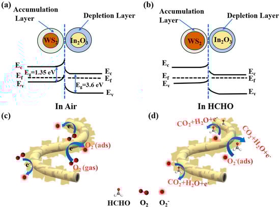 Firstly, the p-n heterojunction between WS2 and In2O3. Figure 5a,b present the energy band diagrams of the WS2/In2O3. When the p-type properties of WS2 are in close contact with the n-type properties of In2O3, the Fermi levels should be equal, which will lead to the transfer of electrons from In2O3 to WS2, while the holes move in the opposite direction [,,]. In Figure 5a, the electron depletion layers (EDL) and the electron accumulation layer (EAL) form at the interface of In2O3 and WS2 in an air environment, respectively. In Figure 5b, upon exposure to HCHO gas, the HCHO molecules chemically interact with the O2− that are adsorbed on the surface. This interaction breaks the equilibrium state of the intrinsic electric field under air conditions. As a result, the trapped electrons are released back to the In2O3, leading to an enhancement of electron density on In2O3 and a decrease in the electrical resistance of the sensor []. Consequently, the sensitivity of the WS2/In2O3 heterojunction to HCHO gas is significantly amplified.