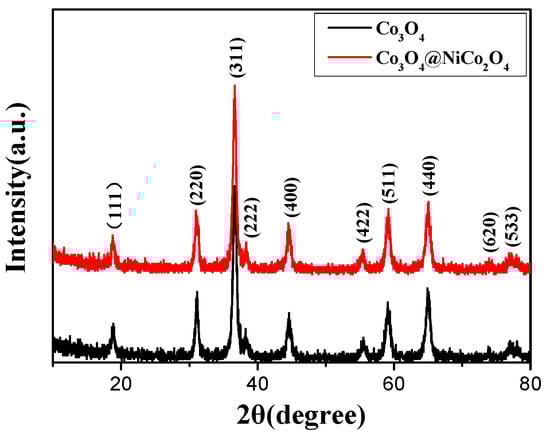 The phase composition of the samples was tested on the X-ray powder diffraction instrument. The results are exhibited in Figure 1. The diffraction peaks of the Co3O4 nanowire include the (111), (220), (311), (222), (400), (422), (511), (400), (650), and (533) crystal phases, which can all be indexed to the characteristic peaks of Co3O4, indicating that the sample was cubic-phase Co3O4 (JCPDS:78-1969). Pure cubic-phase Co3O4 nanowire provided the theoretical basis for the preparation of the Co3O4 nanowire@NiCo2O4 nanosheet hierarchical array structure. Compared with the diffraction pattern of the Co3O4 nanowire, the diffraction peaks of the Co3O4 nanowire@NiCo2O4 nanosheet hierarchical array demonstrated basically no change except for a slightly enhanced diffraction peak intensity, which can be indexed to the characteristic peaks of spinel-phase NiCo2O4 (JCPDS:73-1702), indicating formation of the core–shell structure of the Co3O4 nanowire@NiCo2O4 nanosheet hierarchical array.