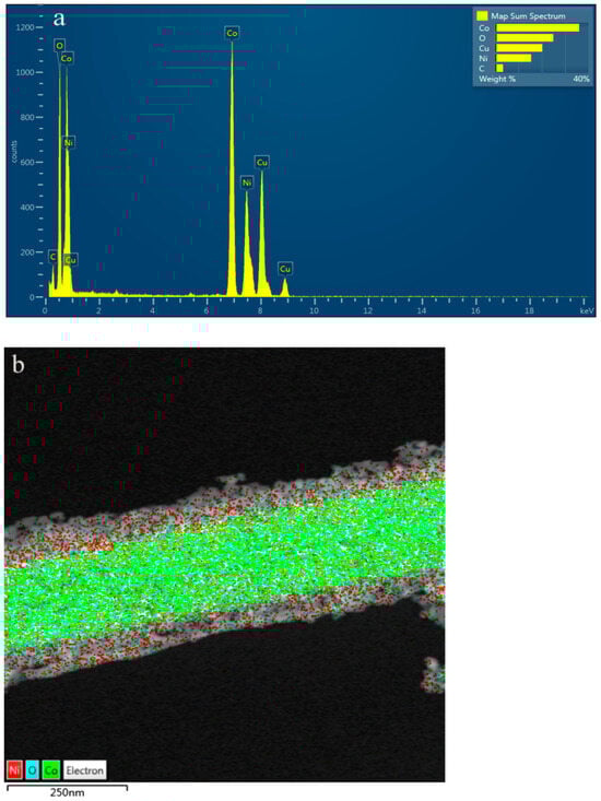 The EDS mapping images are shown in Figure 4. Figure 4a shows that there is 18.48 wt% of the Ni element. Figure 4b showed that the Ni element was uniformly distributed. It also confirmed that the NiCo2O4 nanosheet was successfully constructed on the Co3O4 nanowire.