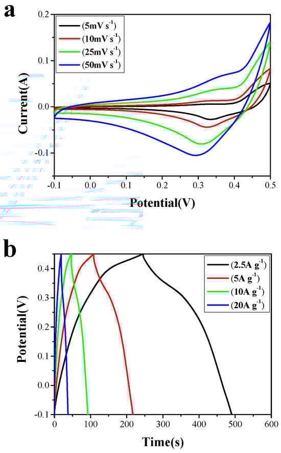 The Co3O4 nanowire array and the Co3O4 nanowire@NiCo2O4 nanosheet hierarchical array were used as electrode materials to test the supercapacitor electrochemical performance. The results are shown in Figure 5. Cyclic voltammetry curves of the samples were tested under different scan speeds (from 5 to 50 mV s−1) in a voltage range from −0.1 to 0.5 V. The redox peaks in the cyclic voltammetry curves of the Co3O4 nanowire electrode material (Figure 5a) are due to the Co2+/Co3+ and Co3+/Co4+ redox reactions [41,42] (Equations (1) and (2)):