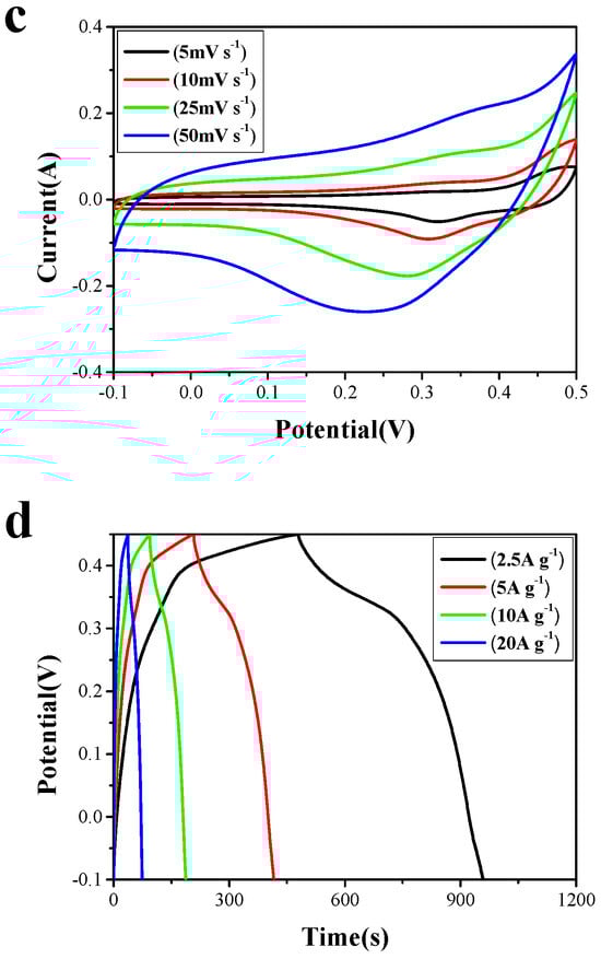 The electrochemical performances comparison of the samples: (a) the CVs at 25 mV s−1; (b) the charge–discharge curves at 5 A g−1; (c) the specific capacitance as a function of scan rate; (d) the specific capacitance as a function of current density.