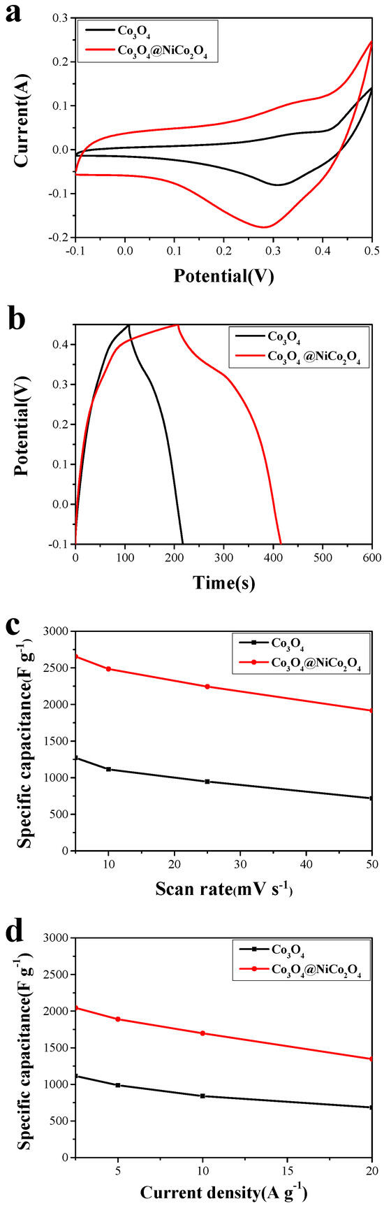 Figure 6a,b shows the comparison of cyclic voltammetry curves of the Co3O4 nanowire array and the Co3O4 nanowire@NiCo2O4 nanosheet hierarchical array at a current density of 25 mV s−1 and the galvanostatic charge–discharge comparison at a current density of 5 A g−1. The specific capacitance of the Co3O4 nanowire@NiCo2O4 nanosheet hierarchical array was higher than that of the Co3O4 nanowire, which may because the two-dimensional nanosheet has a larger BET and has more contact surfaces during the redox reaction of the electrode than the one-dimensional nanowire. The specific capacitance of the Co3O4 nanowire@NiCo2O4 nanosheet hierarchical array was significantly better than that of the Co3O4-based nanocomposites reported in the literature, such as Co3O4@MnO2 (1532.4 F g−1, 1 A g−1) [43] and Co3O4@NiCo2O4 (672 F g−1, 0.5 A g−1) [37].