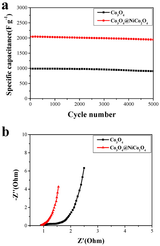 Galvanostatic charge–discharge cycling of the Co3O4 nanowire array and the Co3O4 nanowire @NiCo2O4 nanosheet hierarchical array were conducted 5000 times at a current density of 5 A g−1 to study the cycling performance. As shown in Figure 6a, the specific capacitance of the Co3O4 nanowire array is 91.2%, and that of the Co3O4 nanowire @NiCo2O4 nanosheet hierarchical array is 94.7%. A key factor in the practical application of electrode materials is cycling performance. According to the literature report, the following results obtain: mesoporous Co3O4 ultra-thin nanosheets (78.5%, 2000 cycles) [8]; Co3O4/MnO2 (93.4%, 5000 cycles) [43]; and CoMoO4/Co3O4 (90.38%, 2000 cycles) [39]. The excellent cycling performance of Co3O4 nanowires@NiCo2O4 nanosheet hierarchical array electrode materials provided a good theoretical basis for practical applications (Table 1).