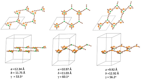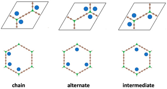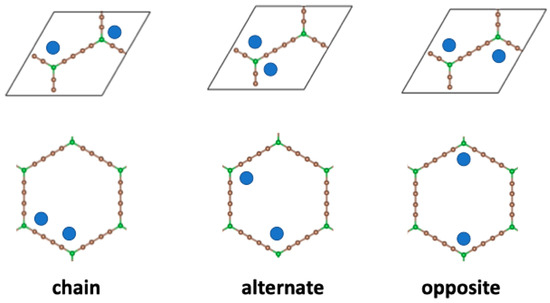 Figure 4. Those configurations correspond to two atoms inside each hexagon in opposite, adjacent (chain configuration), or alternate vertices, respectively. Starting with those initial configurations, the final configurations obtained after full structural optimization, allowing for relaxation of