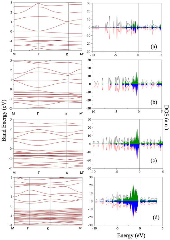 Figure 10. The DOSs are plotted in the energy range between −10 eV and +5 eV. In all cases, the Ni-doped layers have a semiconducting character. The electronic energy band gap is direct, and it occurs at the Γ point. The band structure evolves smoothly as the number of Ni atoms per cell increases. The gap is quite narrow (0.096 eV) for BGDY-1Ni. Then, the gap increases with the number of Ni atoms: 0.337 eV in BGDY-2Ni, 0.460 eV in BGDY-3Ni, and 0.578 eV in BGDY-6Ni. The occupied electronic bands near the Fermi level have a predominant nickel