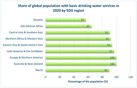 - Alemayehu, M.A.; Agimas, M.C.; Shewaye, D.A.; Derseh, N.M.; Aragaw, F.M. Spatial distribution and determinants of limited access to improved drinking water service among households in Ethiopia based on the 2019 Ethiopian Mini Demographic and Health Survey: Spatial and multilevel analyses. Front. Water 2023, 5, 1166733. [Google Scholar] [CrossRef]