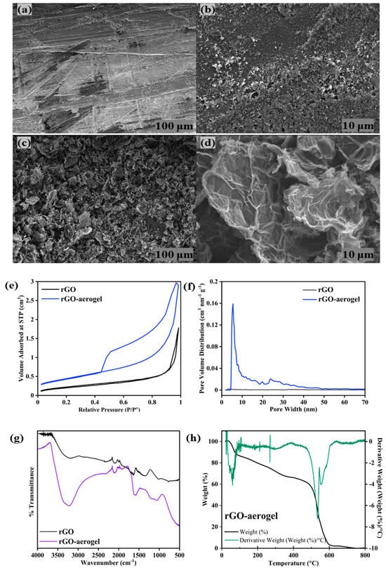 FE-SEM micrographs of (a,b) rGO and (c,d) rGO-aerogel. (e,f) Nitrogen adsorption–desorption isotherms and the corresponding average pore size distribution of rGO and rGO-aerogel. (g) FT-IR Spectra of rGO and rGO-aerogel and (h) TGA/DTG graphs of rGO-aerogel.