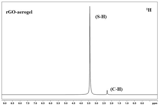 NMR spectra analysis was conducted with approximately 15–50 mg of Heavy Water, Deuterium Oxide (D2O) reaction mix dissolved in a glass NMR test tube in 0.5 mL deuterated chloroform (CCl3D). For 1H NMR, 32 scans were obtained per sample at a free induction decay (FID) resolution of 0.25 Hz and at 3.99 s acquisition time. For 13C NMR, 1024 scans were obtained per sample at an FID resolution of 0.72 Hz and 1.37 s acquisition time. The strong peak at 3.3 ppm of NMR could be due to the presence of the S-H functional group from cysteamine on the rGO-aerogel (Figure 3) [48].