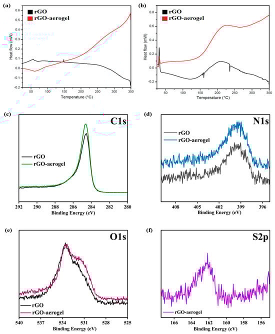DSC profile of rGO and rGO-aerogel (a,b) heating and cooling scan. (c–f) High resolution (HR) C1s, N1s, O1s, and S2p XPS spectra patterns of rGO and rGO-aerogel.