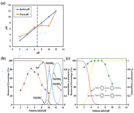 Ni2+ exists as Ni2+, Ni (OH)+, Ni (OH)2, Ni (OH)3−, and Ni (OH)42− at the pH ranges of <7.8, 7.8–10.9, 8.3–13.1, >9.3, and >11.8, respectively (Figure 5b). The Ni2+ uptake from the rGO-aerogel was low until the initial pH of 4 due to the higher competition of H+ towards the rGO-aerogel. For Ni2+, maximum uptake on the rGO-aerogel occurred at pH 5.0. However, Ni2+ adsorption was reduced above pH 6.0 due to the reduction in the net positive charge of Ni2+ which forms ionic interactions with the rGO-aerogel.