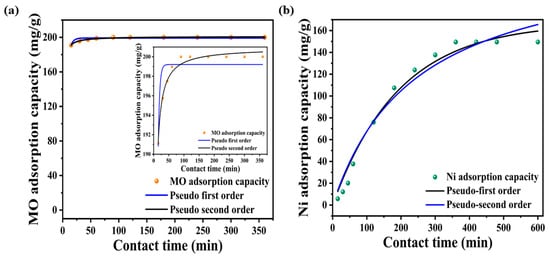The adsorption kinetics of MO and Ni2+ with initial 20 mg L−1 concentrations at 25 °C with a dose of 0.1 g L−1 were analyzed using pseudo-first-order and pseudo-second-order kinetic models. These models help understand the adsorption process’ mechanism and rate-controlling steps, which are crucial for the design of efficient adsorption processes. Figure 6a,b depicts the experimental data and the fitting results with the corresponding parameters in the inlet.