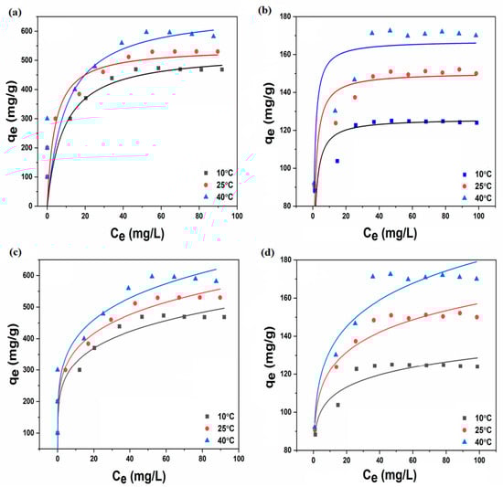 where qe is the quantity of target contaminant adsorbed per unit weight of adsorbent at equilibrium concentration (mg g−1), Ce is the concentration of equilibrium (mg L−1), qmax is the Langmuir maximum adsorption capacity (mg g−1), KL is the Langmuir constant (L mg−1), KF is the Freundlich maximum adsorption capacity (mg g−1), and 1/n is the adsorption intensity of the system.