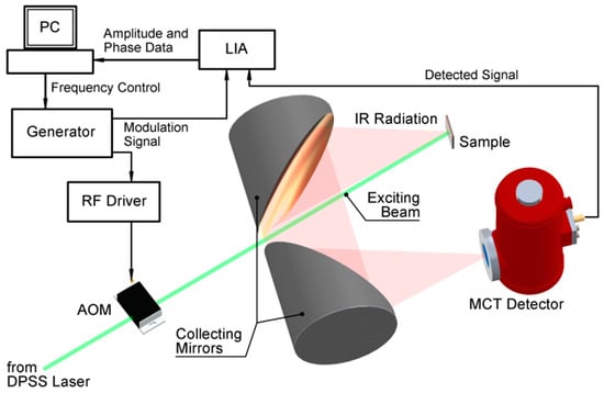 Figure 1 shows the experimental set-up with the DPSS laser (λ = 532 nm, 800 mW dc power) with an intensity modulated in the range of 100 Hz–10 MHz using an acoustic–optical modulator. The IR radiation emitted from the sample is collected and collimated using two parabolic mirrors (Au-coated, off-axial). The emitted IR radiation is focused onto the detector (mercury cadmium telluride (MCT)) with a window coating of antireflection Germanium. For spectrally resolved measurements, appropriate filters are used in the front of the detector, which is connected to a lock-in amplifier and to a PC, where the signals corresponding to each modulation frequency are analyzed [24].