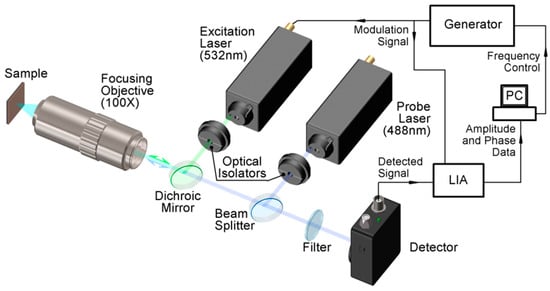 Thermoreflectance is the technique that detects variations in temperature near the surface by relying on temperature-dependent optical reflectance [24]. It is based on the modulation of the sample’s temperature with a metallic layer (transducer) deposited on its surface and monitors the changes in the layer’s reflectivity. When the metal layer’s temperature is increased, the number of phonons inside this layer is also increased, which in turn increases the number of electron–phonon collisions. As a result, the light absorption coefficient decreases, leading to an increase in the light reflection.