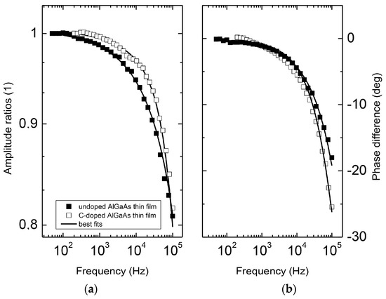 Variation of (a) amplitude ratios and (b) phase difference with frequency for Al0.33Ga0.67As alloys with and without C doping [25].