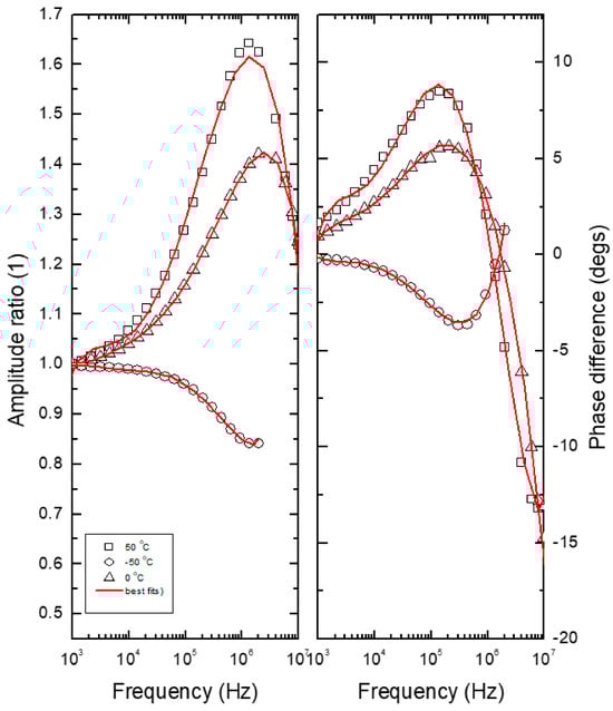 Variation of amplitude ratios and phase difference with frequency for a sample at three different temperatures: −50 °C, 0 °C, and 50 °C [24].