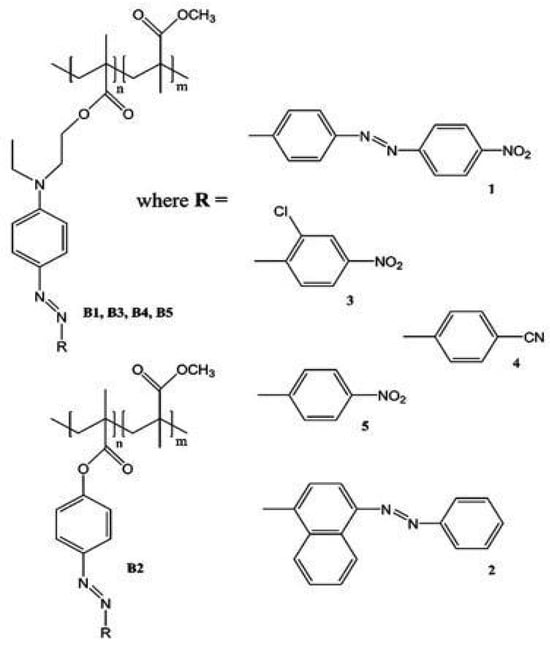 Molecular structures of push–pull type (B1, B3, B4, and B5) and azobenzene-type (B2) polymers [29].
