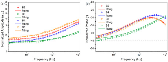 (a) Variation of normalized amplitude and (b) normalized phase with modulation frequency for the B2–B5 azo polymer thin films in their trans state [29].