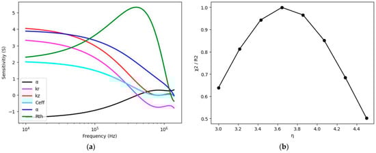 (a) Sensitivity analysis of thermal properties of PEDOT:PSS (w.r.t.) scanning modulation frequency (Hz) for parameters described in Table 5; (b) Reduced chi-square statistic vs. anisotropic coefficient (η).