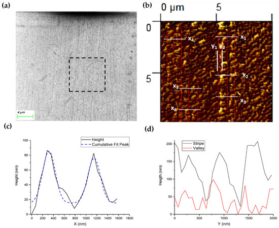 Figure 2. (a) SEM image of nanostructured glass (20% KOH during 180 min) with 2.5 kx magnification; the black square demarks an area of the size of the AFM measurement; (b) AFM topographic image of the nanostructured glass with red lines that indicate the stripes orientation; (c) profile obtained through the average of the transversal cuts (perpendicular to the stripes) shown by the black lines (x1 to x6) in the AFM image; and (d) profile of transversal cuts along a valley between stripes (y1) and the stripes summit (y2), indicated by the white vertical lines in the AFM image.