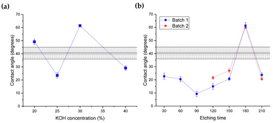 An even more unexpected scenario was the increment of the contact angle observed after etching for 180 min with KOH concentrations of 20 and 30% (Figure 3a). If we were to use the Wenzel model in this case, we would find a roughness factor below one, which is not possible. Through AFM measurements (Figure 2b), we found that the ratio between rough and flat surface area was 1.1 for the sample etched for 180 min with 20% KOH. This sample had a contact angle of 49.2°, but if we use r = 1.1 in the Wenzel model, the contact angle gives ~ 36 ° —a lower value than the θ y , as expected for this model. Conversely, the Cassie–Baxter regime explains increments of contact angles but only for hydrophobic surfaces (with θ y > 90 ° ) or for hydrophilic ones in which the structure has undercuts [27].