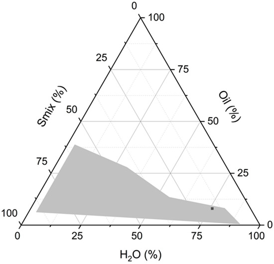 The O/W microemulsion composition was obtained by pseudo-ternary phase diagram using Cremophor RH 40 and Labrasol ALF as surfactants mixture (Smix). The surfactants 1:1 molar ratio was selected from our previous screening experiments as suitable in terms of replacement of more toxic surfactants. The phase diagram of the system was built by diluting different ratios of Smix and oil with water using the titration method. The diagram is reported in Figure 1.