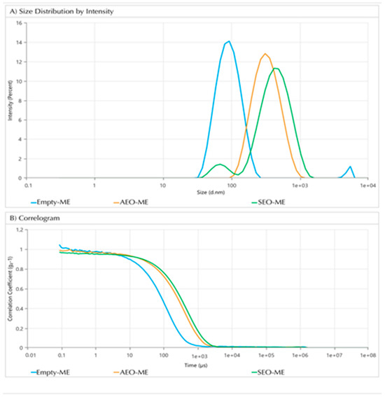 Indeed, the developed microemulsions loaded with EOs displayed no signs of changes in the visual aspect and in the average size of the oil droplets, and no variation of the EO recovery during refrigerated storage for 4 weeks was observed. Noteworthily, the correlation coefficient over time (µs) provides information on the dynamics of particle movement in the system. In the case of the empty microemulsion, the rapid decay in the correlation function is indicative of a smaller droplet size and less complex internal dynamics, which is consistent with its size of 86.2 nm. In the case of microemulsions loaded with the EOs, the curves exhibit a slight deceleration in decay, indicative the largest particle sizes upon loading with EOs. In addition, the similarity in the decay pattern for AEO- and SEO-loaded microemulsions suggested that the microemulsion systems exhibit analogous dynamic stability.