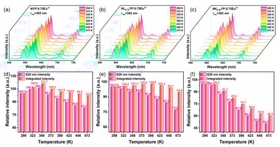 - Yang, Z.; Ye, M.; Sun, C.; Yang, S.; Zheng, Y.; Xu, D.; Sun, J. Structural and luminescence characterization of red-emitting Li6SrLa2Nb2O12:Eu3+ phosphors with excellent thermal stability. J. Mol. Struct. 2023, 1292, 136071. [Google Scholar] [CrossRef]
