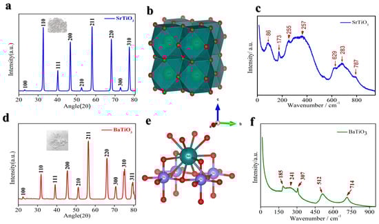 (a) XRD pattern SrTiO3 (STO). (b) Crystal structure of STO. (c) Raman shifts of STO. (d) XRD pattern of BaTiO3 (BTO). (e) Crystal structure of BTO. (f) Raman shifts of BTO.