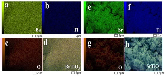 SEM mapping images of BTO and STO at 2 µm. (a–d) Ba, Ti, O, and BaTiO3, respectively. (e–h) Sr, Ti, O, and SrTiO3, respectively.