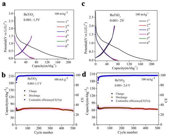We investigated the lithium storage capabilities of BTO (1C = 114 mA g−1) (in detail calculation of theoretical capacity are in Supplementary Information Page S-6) when used as an anode material for lithium-ion batteries (LIBs). The electrochemical performance of BTO was tested in three different voltage ranges: 0.001–1.5 V, 0.001–2.0 V, and 0.001–2.5 V, at room temperature. As depicted in Figure 4a, the GCD curve for the 0.001–1.5 V range shows a discharge capacity of ~200 mA h g−1, while the charge capacity is 70 mA h g−1, remaining stable over 500 cycles with ~99.99% coulombic efficiency, as shown in Figure 4b. In Figure 4c, the GCD curve for the 0.001–2.0 V range indicates a specific capacity of about 80 mA h g−1, which is maintained for over 500 cycles, as demonstrated in Figure 4d. Additionally, we tested the charge–discharge performance at 0.001–2.5 V, but there is no significant difference we observed, as shown in (Supplementary Information Figure S3b). However, cycling performance is poor, as demonstrated in (Supplementary Information Figure S4b).