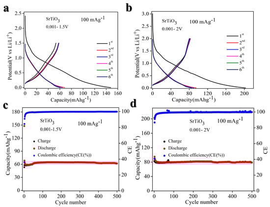 Similarly, we explored the lithium storage capabilities of STO (1C = 146 mA g−1) (in detail in Supplementary Information Page S-6). The electrochemical performance of STO was evaluated across three distinct voltage ranges: 0.001–1.5 V, 0.001–2.0 V, and 0.001–2.5 V, all measured at room temperature. As illustrated in Figure 5a, the GCD curve for the 0.001–1.5 V range exhibits a discharge capacity of approximately 200 mA h g−1, with a corresponding charge capacity of 70 mA h g−1, demonstrating stability over 500 cycles with ~99.99% coulombic efficiency, as shown in Figure 5b. In Figure 5c, the GCD curve for the 0.001–2.0 V range indicates a specific capacity of around 80 mA h g−1, which is sustained over 500 cycles, as evidenced in Figure 5d. Furthermore, the charge–discharge response at 0.001–2.5 V was examined, revealing no significant differences, as depicted in the GCD curve ((Supplementary Information Figure S3a)) but poor cycling performance, as shown in (Supplementary Information Figure S4a).